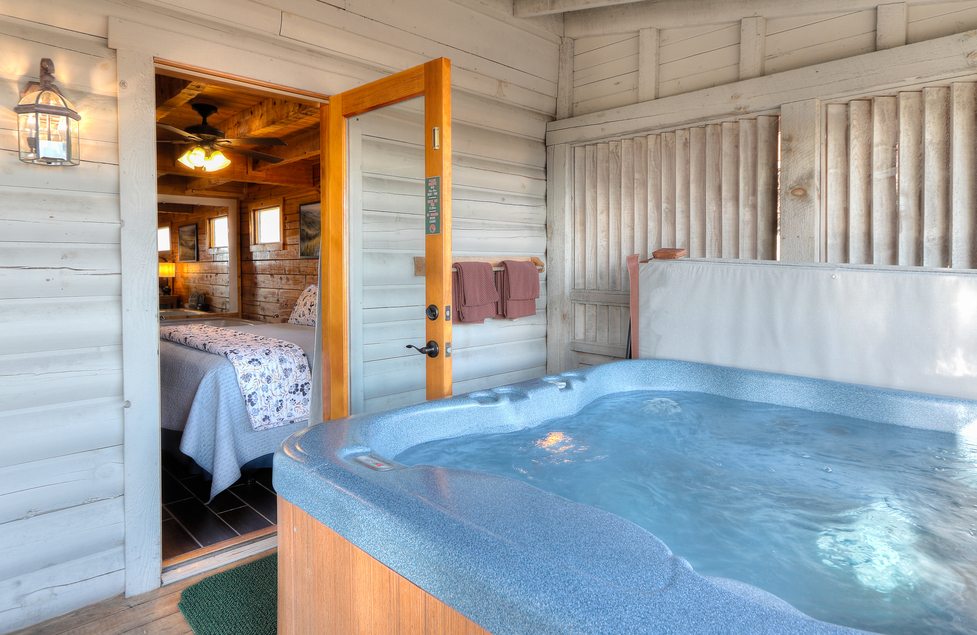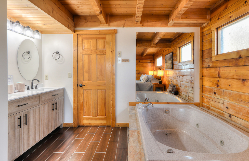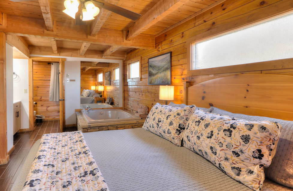 - Bedroom – King Bed, TV, Private Bath with 4×6 Jetted Tub, Double Bowl Vanity, 43” Walk-In Shower w/Seat