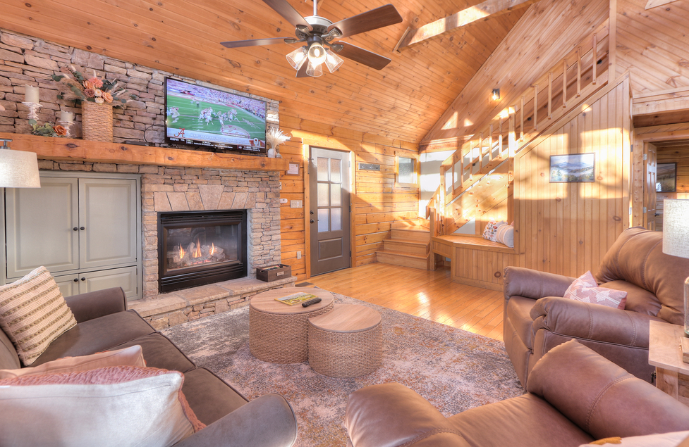 - Living Room – Queen Sofa Sleeper*, 2 Recliners, Gas Fireplace, TV, Blu Ray Player