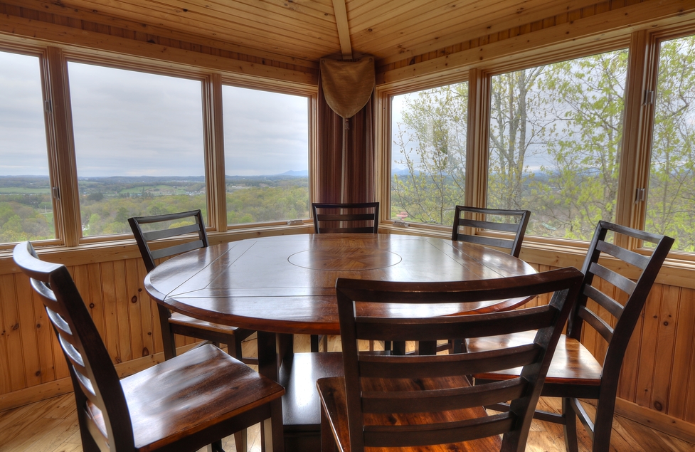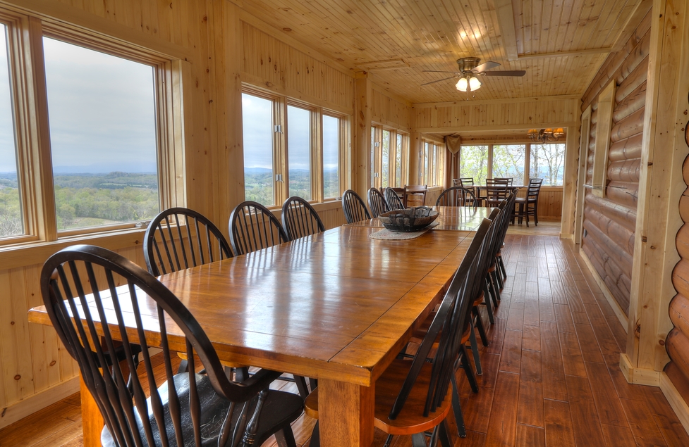 - Glassed In Dining Area – Dining Table for 14, Pub Table for 6, 2 Recliners, Swing Bed