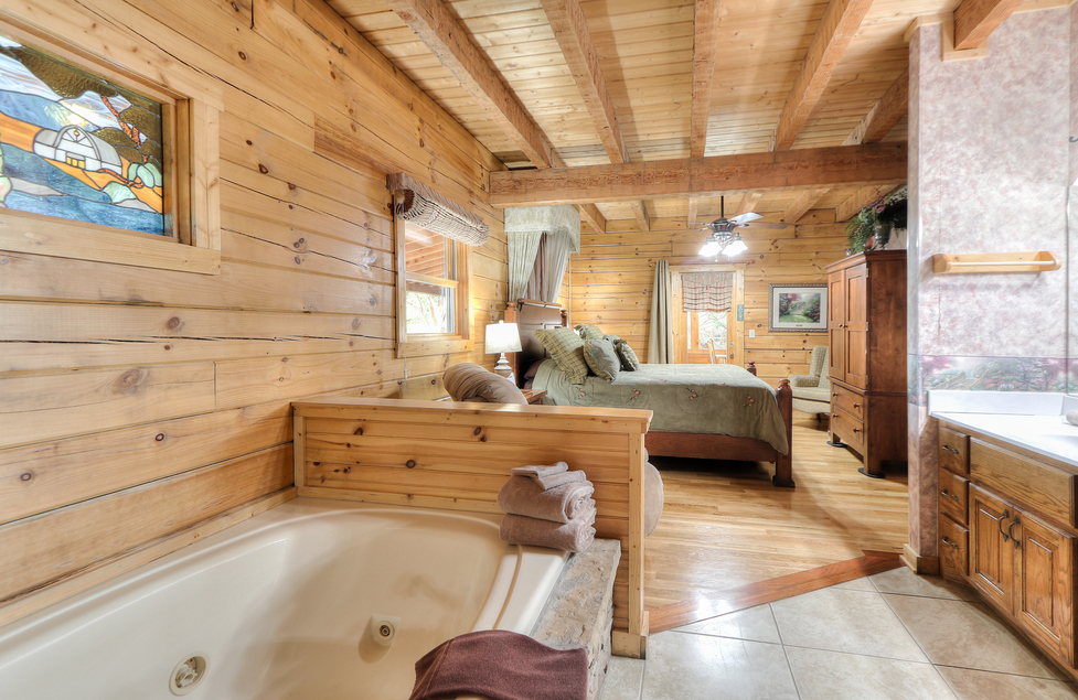 - Bedroom # 1 – King Bed, Chair, 36″ TV, Private Bath w/47″ Walk-In Shower w/Seat, 4×6 Jetted Tub