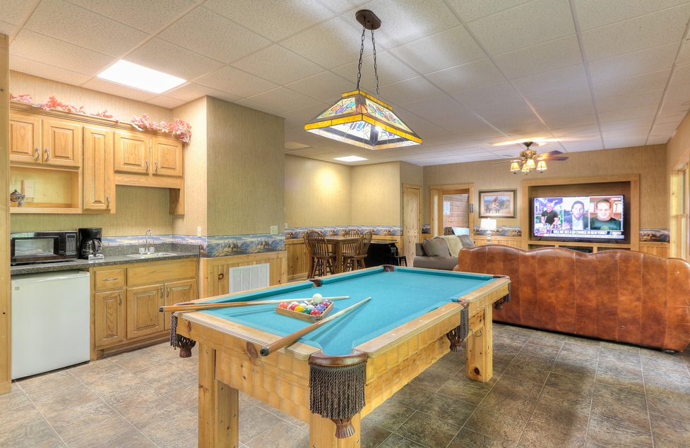 - Gameroom – Queen Sofa Sleeper*, Sofa, 70″ Smart TV, Pool Table, Arcade, Foosball, Table for 4